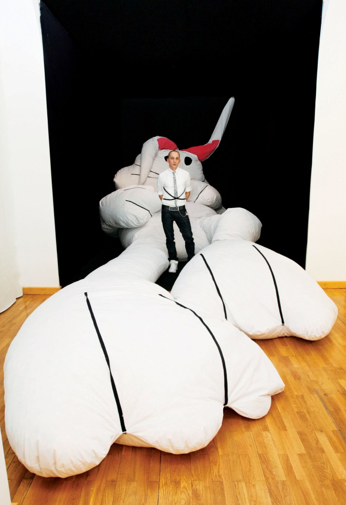 All the works are based on the idea of a game and search for identity in playing. The paintings, installation and mural offer the viewer different playing modes and participation in the game, so in the mural the viewer can reconstruct “incomplete identities” by connecting dots, or there is a huge toy rabbit one can play with, lie down and feel carefree.