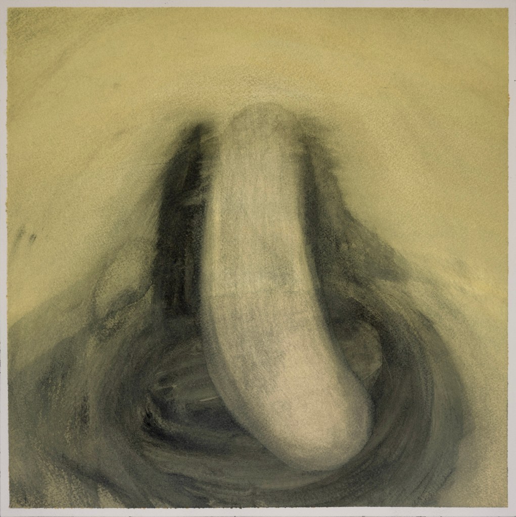 Recurring motifs in this body of work include round shapes with a spiritual, almost optimistic quality—like a light at the end of a tunnel—empty landscapes, self-portraits, phalluses, and cartoonish fantasy bunny shapes. Together, they express the complexity of my experience and identity during this transformative period.